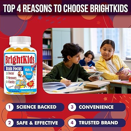 Thông tin sản phẩm BrightKids Focus Gummies for Kids & Teens – Brain Gummies for Memory and Focus, Omega 3 DHA Brain Vitamins for Kids, Attention & Learning Support Supplement, Drug-Free, Made in USA, 60 Count