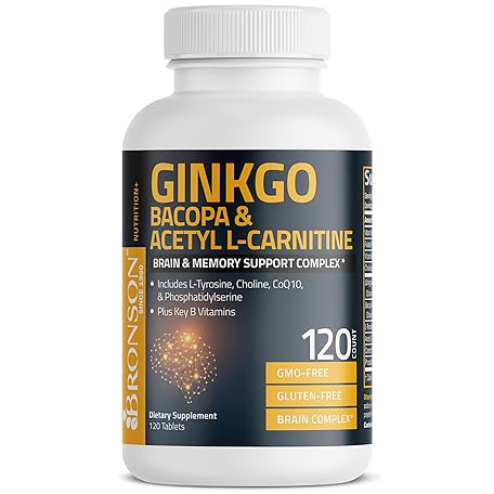 Bronson Ginkgo, Bacopa & Acetyl L-Carnitine Brain & Memory Support Complex with L-Tyrosine, Choline, CoQ10 & Phosphatidylserine Plus Key B Vitamins Non-GMO, 120 Tablets