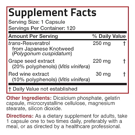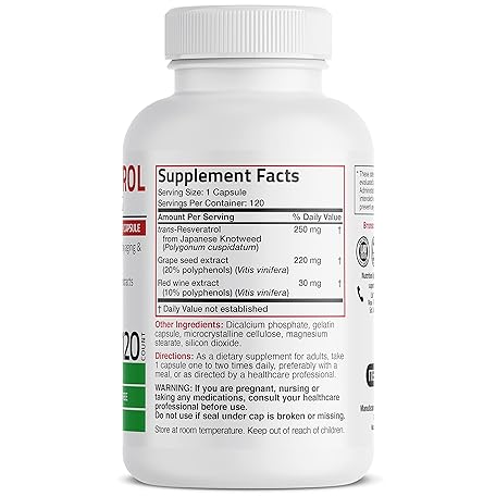 Sản phẩm Bronson Resveratrol 500 Complex Standardized Trans-Resveratrol + Grape Seed & Red Wine Extract, 120 Capsules đang được bán với giá ưu đãi là $27.2391 tại nước Mỹ.