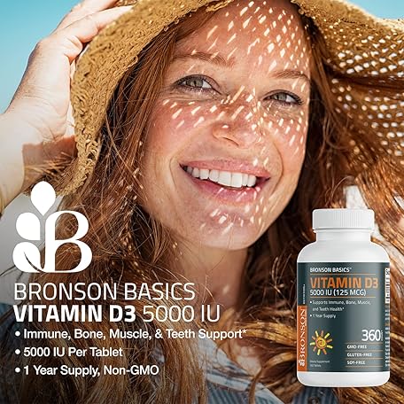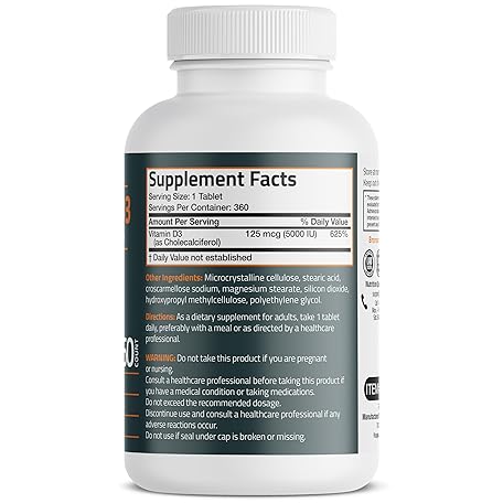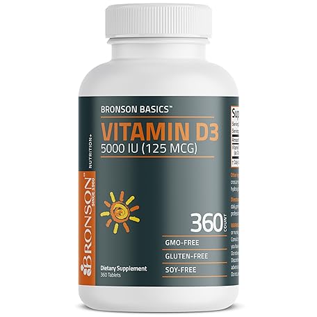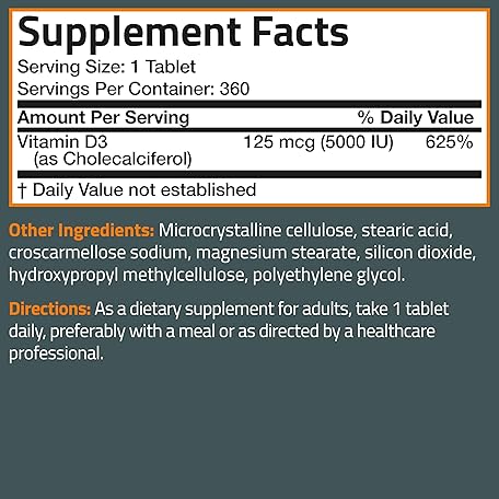 Thông tin sản phẩm Bronson Vitamin D3 5000iu (125mcg) 1 Year Supply for Healthy Muscle Function and Immune Support, Non-GMO, 360 Tablets