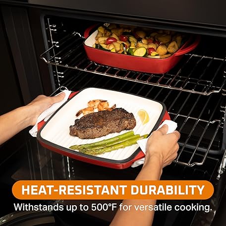 Thông tin sản phẩm Bruntmor 2-in-1 Square Enameled Cast Iron Dutch Oven Baking Pan and Gridle Lid with Dual Handles, Cast Iron Skillet lid, Coating Gridle for Baking, Bacon,Steaks - Red