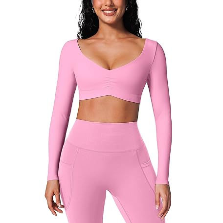 BRXL Long Sleeve Crop Tops for Women Built in Bra Padded Yoga Shirts Deep V Neck Buttery Soft Slim Fit Workout Pilates Gym