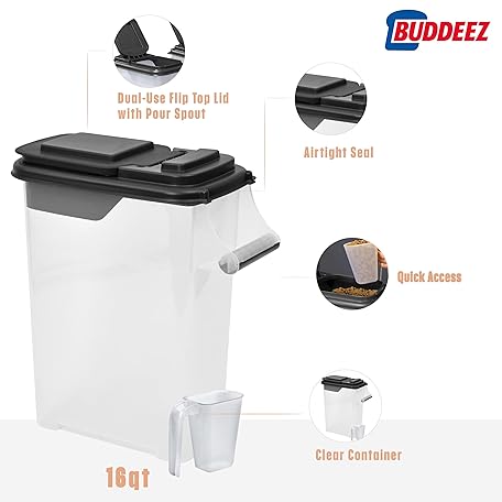 Thông tin sản phẩm Buddeez Pet Food Storage Containers - Capacity Dog Food Storage Container, Cat Food Container, Bird Seed Storage Container, with Durable EZ Grip Handle, EZ Flip Lid & Scoop (2 Pack) 16 QT/16 LB