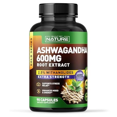 Built by Nature Ashwagandha 600mg – Extra Strength Adaptogen for Stress Relief, Mood, Energy & Sleep – Cortisol Support – Root Extract with 2.5% Withanolides - Non-GMO, Vegan – 90 Capsules