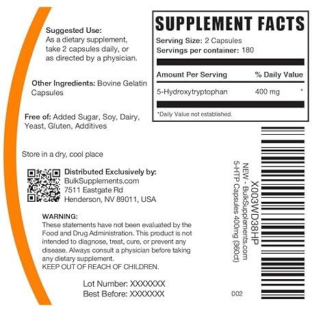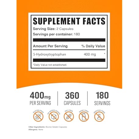 BulkSupplements com 5-HTP Capsules - 5-Hydroxytryptophan, 5 HTP Supplement - 5-HTP 400mg, for Overall Well-Being - Gluten Free, 2 Capsules per Serving, 360 Count (Pack of 1)
