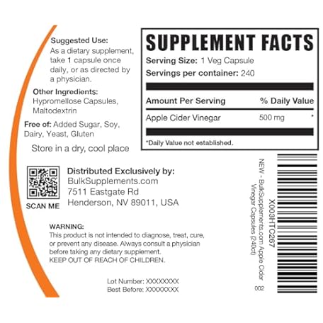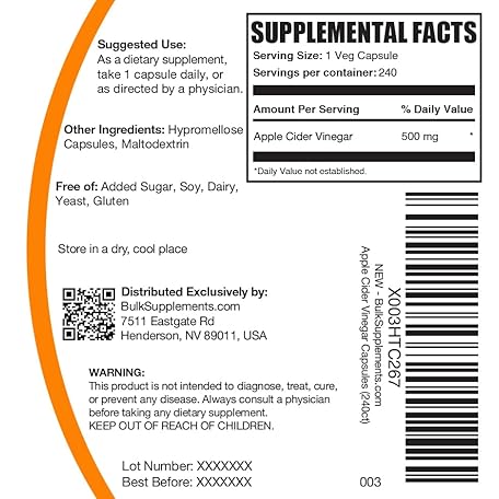 Thông tin sản phẩm BulkSupplements com Apple Cider Vinegar Capsules - ACV Capsules, Apple Cider Vinegar Supplements, Apple Cider Vinegar 500mg - Gluten Free, Capsule per Serving, 240 Capsules (Pack of 1)