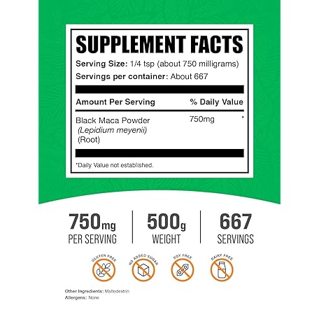 Thông tin sản phẩm BulkSupplements com Black Maca Powder - Black Maca Root Supplement, Herbal Supplement for Men & Women - Vegan, Gluten Free, 750mg per Serving, 500g (1.1 lbs) (Pack of 1)