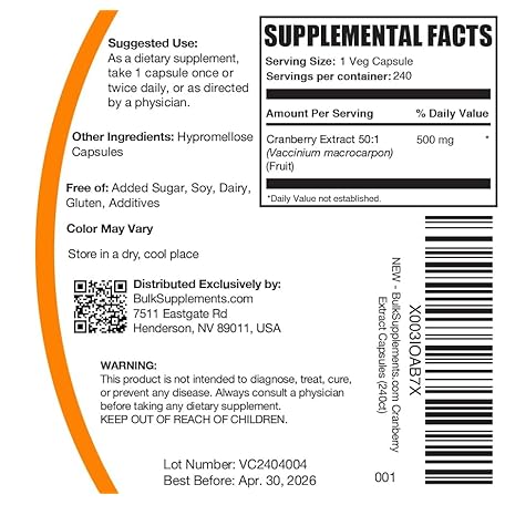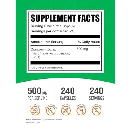 Thông tin sản phẩm BulkSupplements com Cranberry Extract Capsules - Cranberry Supplements for Men & Women, Herbal Supplement - Vegan & Gluten Free, 1 Capsule per Serving (500mg), 240 Count (Pack of 1)