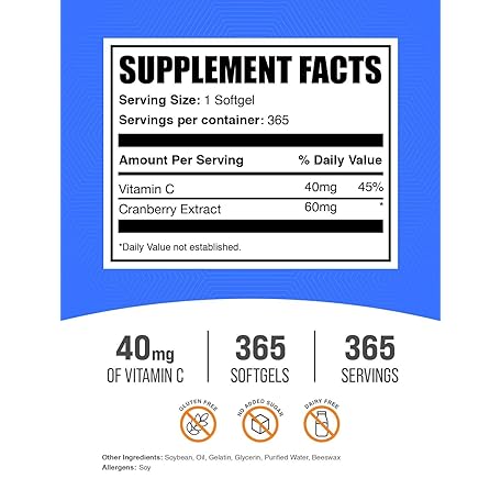 Thông tin sản phẩm BulkSupplements com Cranberry with Vitamin C Softgels - Antioxidants Supplement, 40mg of Vitamin C - Gluten Free, 1 Softgel per Serving, 365 Count (Pack of 1)
