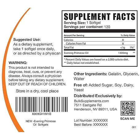 Thông tin sản phẩm BulkSupplements com Evening Primrose Oil Softgels - GLA Supplements, Evening Primrose Oil 1300mg - Gluten Free, 1 Softgel per Serving, 120 Count (Pack of 1)