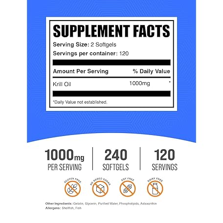 Thông tin sản phẩm BulkSupplements com Krill Oil 1000mg Softgels - Antarctic Krill Oil Supplement - Omega 3 Supplement, DHA Supplement - Gluten Free, 2 Softgels per Serving, 240 Count (Pack of 1)