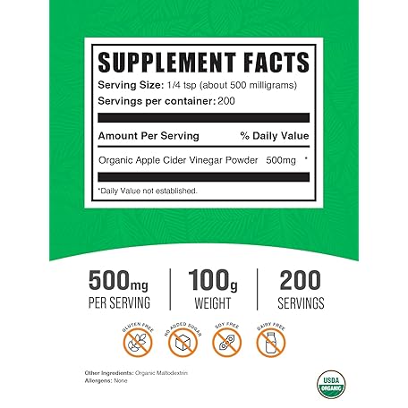 Thông tin sản phẩm BulkSupplements com Organic Apple Cider Vinegar Powder - Apple Cider Vinegar Supplement, ACV for Digestive Support - Vegan & Gluten Free, 500mg per Serving, 100g (3.5 oz) (Pack of 1)