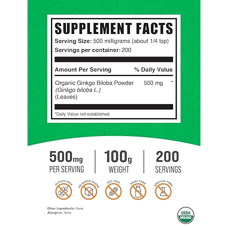 Thông tin sản phẩm BulkSupplements com Organic Ginkgo Biloba Powder - from Ginkgo Biloba Leaf, Herbal Supplement - Vegan & Gluten Free, 500mg per Serving, 100g (3.5 oz) (Pack of 1)