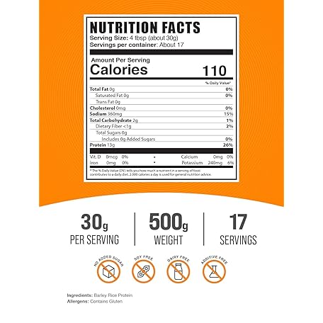Thông tin sản phẩm BulkSupplements.com Barley Rice Protein Powder - Vegan Protein Powder, Sports Nutrition - Unflavored & Dairy Free, 30g per Serving, 500g (1.1 lbs) (Pack of 1)