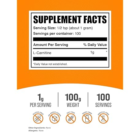 Thông tin sản phẩm BulkSupplements.com L-Carnitine Powder - Carnitine Supplement, Amino Acid Supplement - Unflavored & Gluten Free, 1g per Serving, 100g (3.5 oz) (Pack of 1)