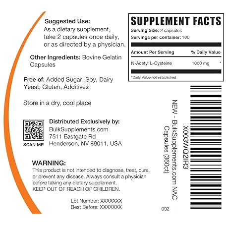 Thông tin sản phẩm BulkSupplements.com N-Acetyl L-Cysteine 1000mg Capsules - N-Acetyl Cysteine 1000mg, NAC Supplement - NAC 1000mg, Gluten Free - 2 Capsules per Serving, 360 Capsules (Pack of 1)