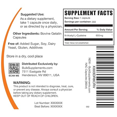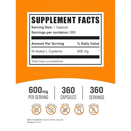 Thông tin sản phẩm BulkSupplements.com N-Acetyl L-Cysteine Capsules - N-Acetyl Cysteine 600mg, NAC Supplement - 600mg per Capsule, Gluten Free - 1 NAC Capsule per Serving, 360 Capsules (Pack of 1)