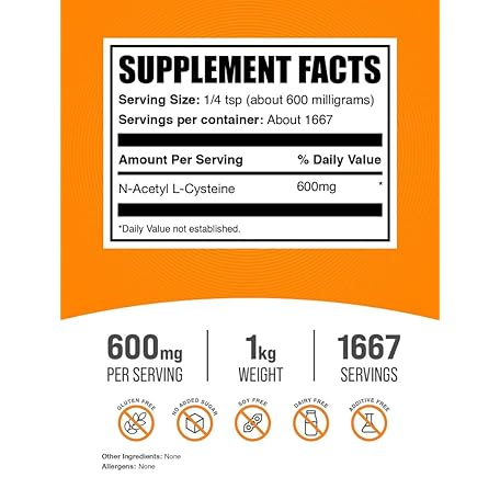 Thông tin sản phẩm BulkSupplements.com NAC Powder - N-Acetyl Cysteine 600mg, NAC Supplement - Antioxidant Support, Gluten Free - 600mg per Serving, 1667 Servings, 1kg (2.2 lbs) (Pack of 1)