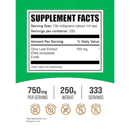 Thông tin sản phẩm BulkSupplements.com Olive Leaf Extract Powder - Herbal Supplement, Antioxidant Source, Olive Leaf Powder - Gluten Free, 750mg per Serving, 250g (8.8 oz) (Pack of 1)