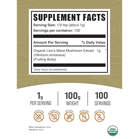 Thông tin sản phẩm BulkSupplements.com Organic Lion's Mane Mushroom Extract Powder - Lions Mane Supplement Powder, Superfood for Well-Being - Vegan, 1g per Serving, 100g (3.5 oz) (Pack of 1)