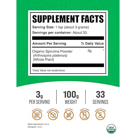 BulkSupplements.com Organic Spirulina Powder - Superfood, Green Spirulina Powder, Herbal Supplement - Vegan-Friendly, 3g per Serving, 100g (3.5 oz) (Pack of 1)