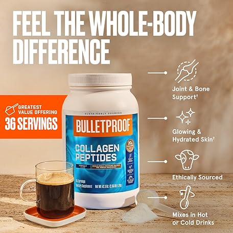 Sản phẩm Bulletproof Vanilla Collagen Protein Powder with MCT Oil, 19g Protein, 42.3 Oz, Value Size, Collagen Peptides and Amino Acids for Healthy Skin, Bones and Joints đang được bán với giá ưu đãi là $87.1891 tại nước Mỹ.