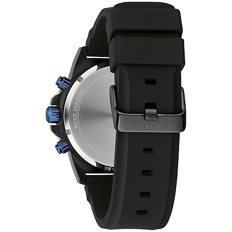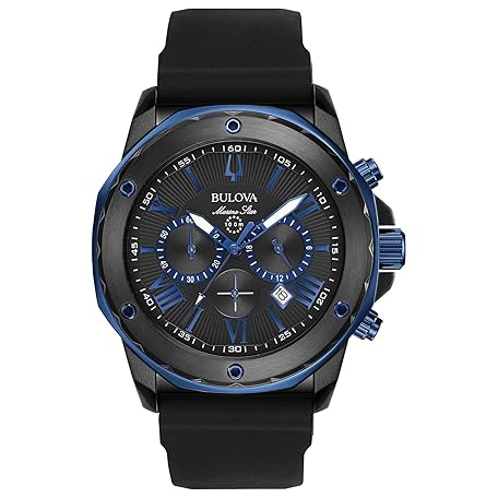 Thông tin sản phẩm Bulova Men's Marine Star Series A Black and Blue Ion-Plated Stainless Steel 6-Hand Chronograph Quartz Watch, Black Silicone Strap, 40mm Style: 98B308