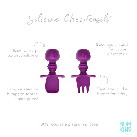 Thông tin sản phẩm Bumkins Baby Utensils Set, Chewtensils Silicone Spoons for Dipping, Self-Feeding, Baby Led Weaning, Trainer Learning, First Stage Eating, Soft Practice Fork and Spoon, Babies 6 Months, Purple