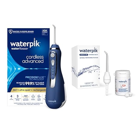 Bundle with Waterpik Blue Cordless Advanced 2.0 Water Flosser WP-583 + Boost Tip with 30 Whitening Tablets, Rechargeable, Portable Oral Irrigator for Travel & Home, Genuine Waterpik Water Flosser Tip
