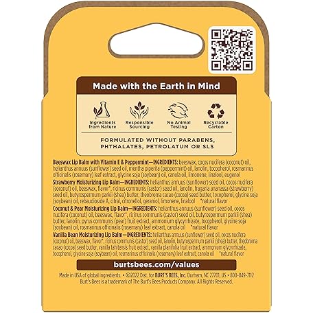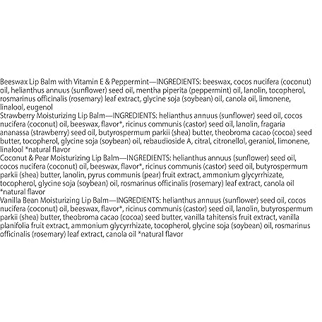 Thông tin sản phẩm Burt's Bees Lip Balm, Beeswax, Strawberry, Coconut and Pear, and Vanilla Bean Pack, With Responsibly Sourced Beeswax, Tint-Free, Natural Lip Treatment, 4 Tubes, 0.15 oz.