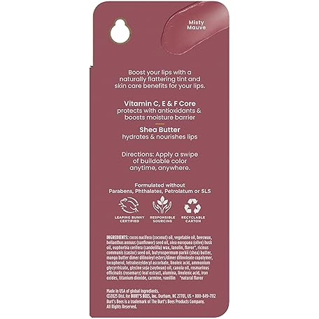 Burt’s Bees Stocking Stuffers Tinted Boosted Balm, Misty Mauve, Hydrating Tinted Lip Balm, 24 Hour Lip Moisturizer with Responsibly Sourced Beeswax, 100% Natural Origin, 1 Count, 0.16oz