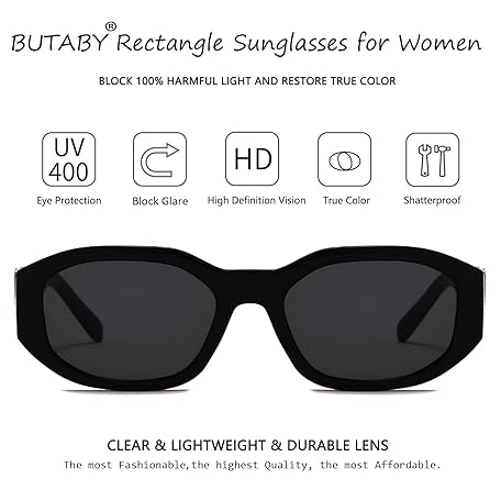 Thương hiệu BUTABY là cái tên nổi tiếng được rất nhiều khách hàng trên thế giới chọn lựa. Với kiểu dáng đẹp mắt, sang trọng, sản phẩm BUTABY Rectangle Sunglasses for Women Retro Driving Glasses 90’s Vintage Fashion Irregular Frame UV400 Protection là sự lựa chọn hoàn hảo nếu bạn đang tìm mua một món cho riêng mình.