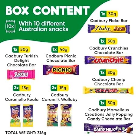 Thông tin sản phẩm Cadbury Chocolate Box 10-Pack – A Delicious Assortment of Australian Favorites Including Flake, Crunchie, Turkish Delight, Picnic, and More – 316g of Classic Cadbury Chocolates