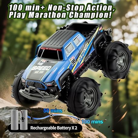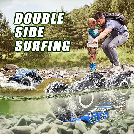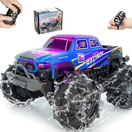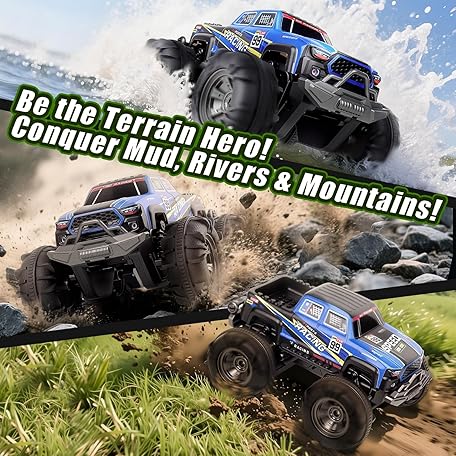 Thông tin sản phẩm Calefwe Amphibious Remote Control Car, Monster Trucks for Boys Age 4-7, Monster Truck Toys W/Blocks & 360°Spin, 4WD All-Terrain Off-Road RC Cars with 2 Batteries 100 min, 2.4Ghz Pool Toy Gift for Kids