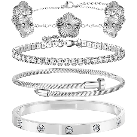 Camhanno Gold Bracelets for Women-4Pcs 18K Gold Plated Love Bangle Tennis Clover Nail Bracelets Stack Set for Women Trendy Non Tarnish Stainless Steel Gold Bangles Accessories Designer Jewelry