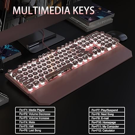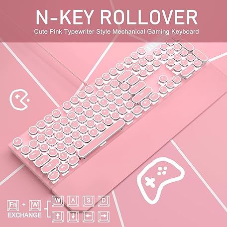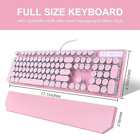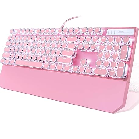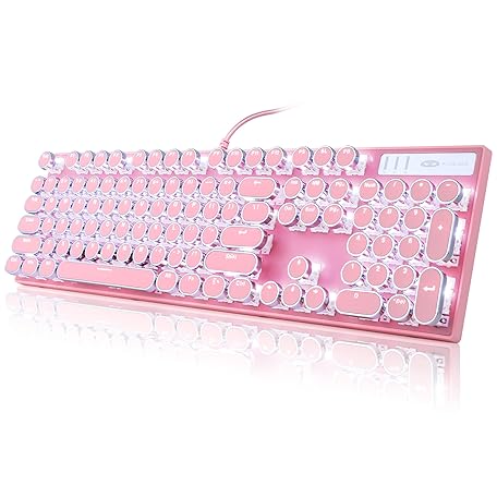 Thông tin sản phẩm Camiysn Typewriter Style Mechanical Gaming Keyboard, Pink Retro Punk Gaming Keyboard with White Backlit, 104 Keys Blue Switch Wired Cute Keyboards, Round Keycaps for Windows/Mac/PC