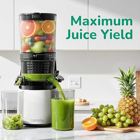Canoly C16 Cold Press Juicer, with a 6" Wide Chute & Self-Precut, 3-in-1 Strainers (Juice & Sorbet & Nut Milk), BPA-Free Construction, Powered by a AC Brushless Motor (Pearl White)