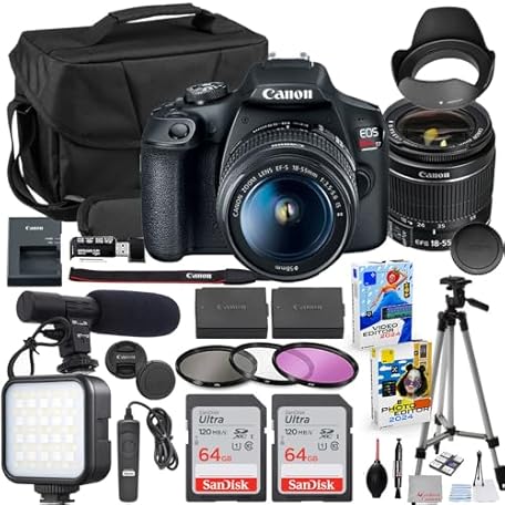 Canon EOS Rebel T7 DSLR Camera with 18-55mm Lens Bundle with Extra Canon Battery + 2X 64GB Memory Cards + Accessory Kit Including Bag, LED Light, Microphone, Remote, Software & More