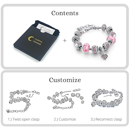 Thông tin sản phẩm Capital Charms Capital Charms Pink Hearts Silver Plated Charm Bracelet Set, Jewelry Gifts with Beads, Charms, and Adjustable Snake Chain, Fits 7.5"+1.5"