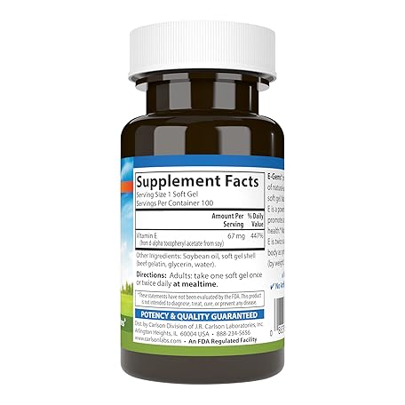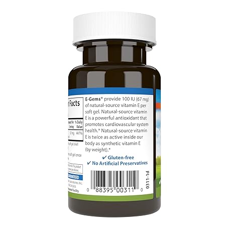 Thông tin sản phẩm Carlson E-Gems, 100 IU (67 mg), Natural-Source Vitamin E, Heart Health & Optimal Wellness, Antioxidant, 100 Soft Gels