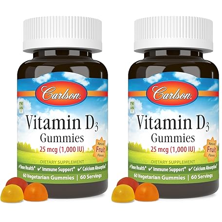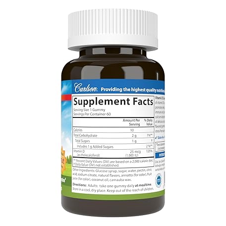 Thông tin sản phẩm Carlson - Vitamin D3 Gummies, 1000 IU (25 mcg), Bone Health, Immune Support & Calcium Absorption, Natural Fruit Flavors, 60 Vegetarian Gummies (Pack of 2)