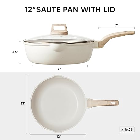Thông tin sản phẩm CAROTE 12Inch Nonstick Deep Frying Pan with Lid, 5.5 Qt Jumbo Cooker Saute Pan with Pour Spout, Skillet Induction Cookware, Non Stick Cooking Pan Kitchen Pan PFOA Free, White Granite