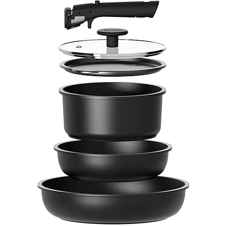 Thông tin sản phẩm CAROTE 6pcs Pots and Pans Set Non Stick, Cookware Sets, Kitchen Set, Oven/Fridge Safe, Space Saving Pots Set, Nonstick Cooking Set with Versatile Detachable Handle, Induction RV Set, Jet Black
