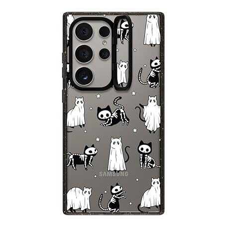 CASETiFY Impact Ring Stand Galaxy S24 Ultra Case [3X Military Grade Drop Tested / 6.6ft Drop Protection/Compatible with Magsafe] - Halloween Ghost Cats and Skeleton Cats - Clear Black