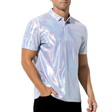 • Casey Kevin Men's Metallic Polo Shirt 70s Disco Outfit Holographic Rave Short Sleeves Polo Shirt Top