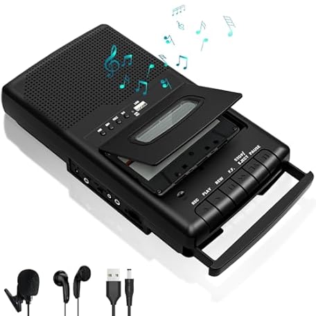 Cassette Player & Recorder with USB Lapel Microphone - USB Player & Portable Tape to MP3 Digital Converter with Headphone Jack, Dual Power (AC/Battery), Retractable Carry Handle