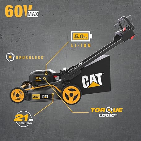 Thông tin sản phẩm CAT DG671 60V 21” Self-Propelled Cordless Lawn Mower 3-In-1 Cutting Modes, Brushless Battery Lawn Mower with TorqLogic, Easy-Adapt Self-Propelled Lawn Mower – Battery & Charger Included