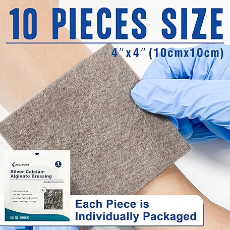 Thông tin sản phẩm Ceeport Ag Silver Calcium Alginate Wound Dressing Pads, 4''x4'' Patches, 10 Individual Pack, Soft Silver Dressings for Wound Care, Gentle Highly Absorbent Dressing, Non Stick Gauze Pads for Wounds