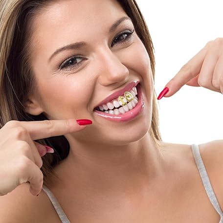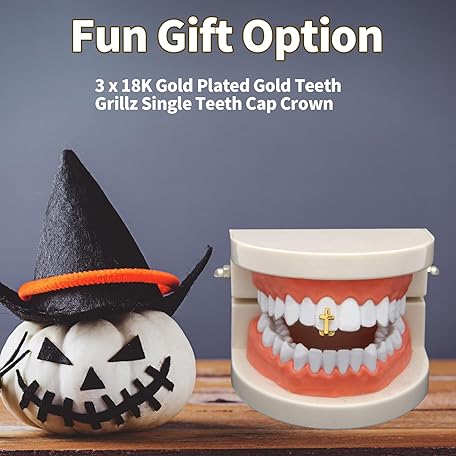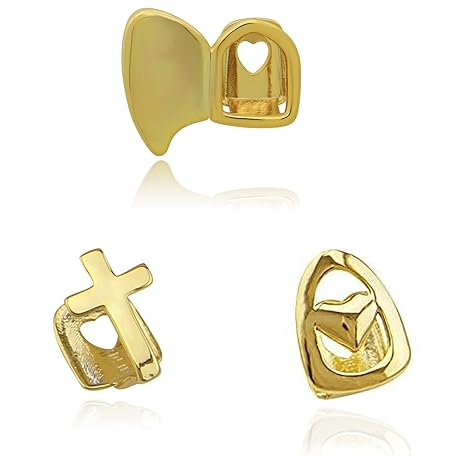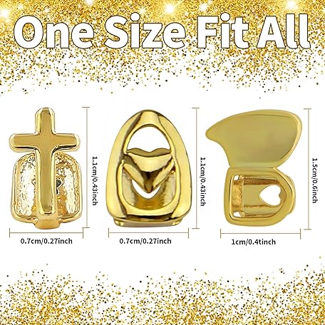 Ceonam 3 Pieces 18K Gold Plated Gold Finish Gold Teeth Grillz Single Teeth Cap Crown, Hip Hop Mouth Grills Fang with Adhesive Beads Party Accessories for Men Women