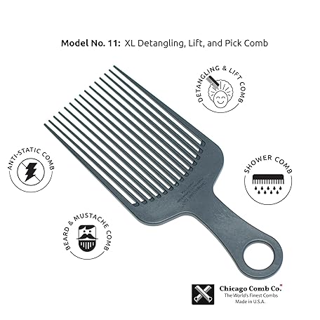 Chicago Comb Model 11 Carbon Fiber, Large Hair Pick, Anti-Static, 7.5 Inches (19 cm), Made in USA